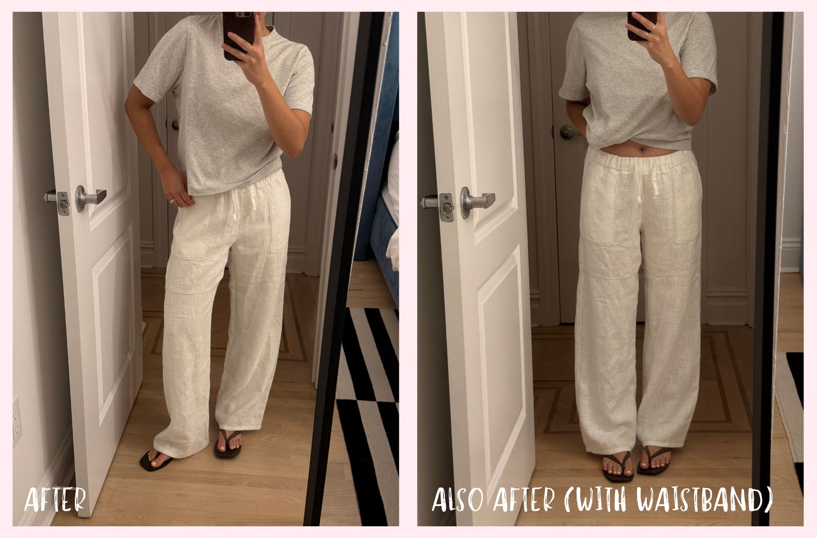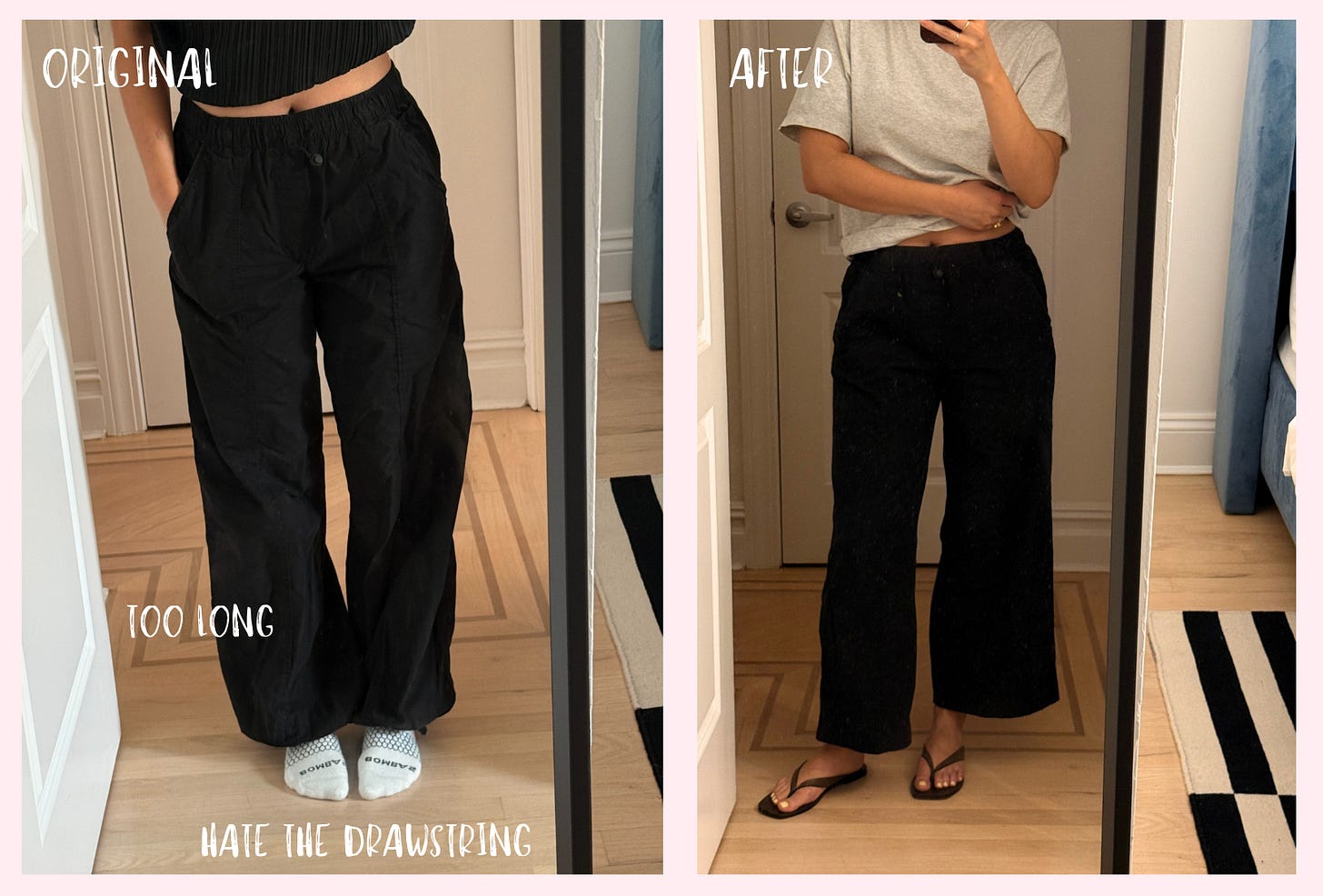 What changes did we make? We just did a standard hem! Nothing fancy. Tailors can add the drawstring back on but I told mine not to and she said to me, “yes, the drawstring is ugly” so I’m glad we were aligned <3 I chose a shorter hem instead of having the pants puddle; I own a lot of pants that have a more puddle-y look, and I wanted the option of something breezier.