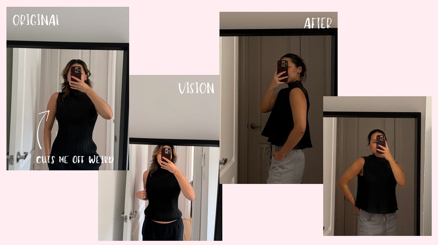 This was honestly so much fun. You know that feeling when you buy something new and you can already imagine 7 different ways to style it? That’s how I feel — but with things I already knew I loved in my closet. My brain is now whirring on other pieces I should bring in; are there midi dresses I want to turn into minis? Are there long sleeves I want to hack the sleeves off of? I really need to get a sewing machine and figure out how to do this myself. But until then, I will be visiting my girl Elena. (Separately - Elena works at Chris French Cleaners, but they’re closing at the end of Sep. Elena’s phone # if people need an incredible tailor: 347-458-2462.)